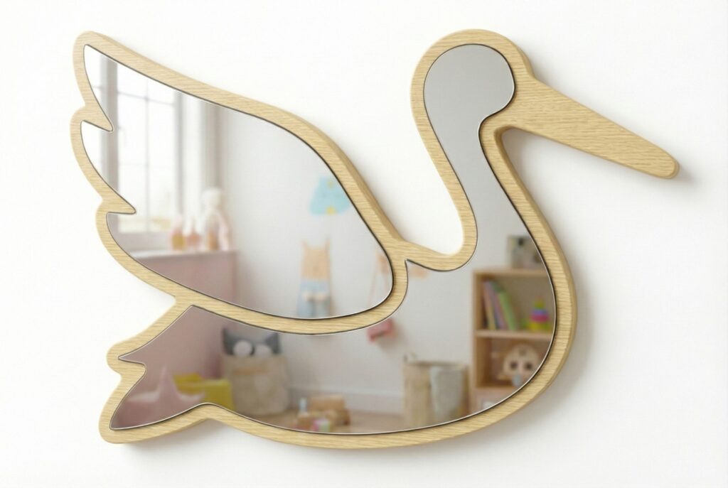 • Diseño Encantador: El espejo con forma de cigüeña estilo kawaii/cartoon, perfecto para inspirar juegos y aventuras en el dormitorio infantil o la sala de juegos.