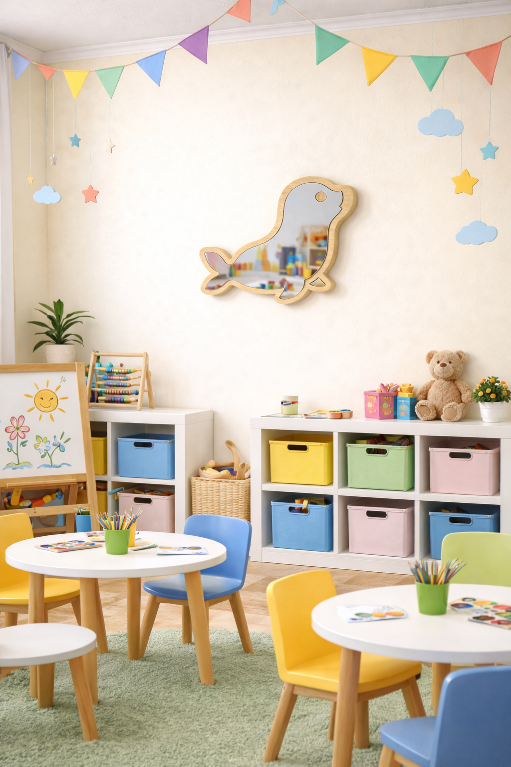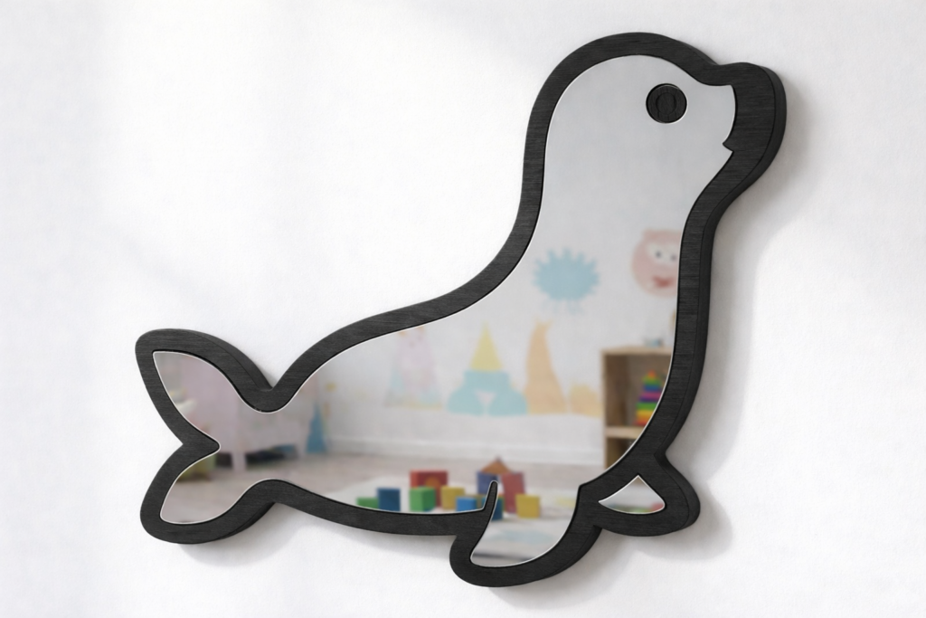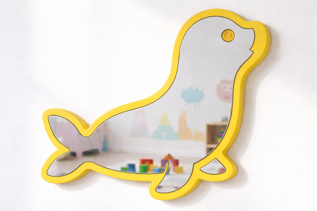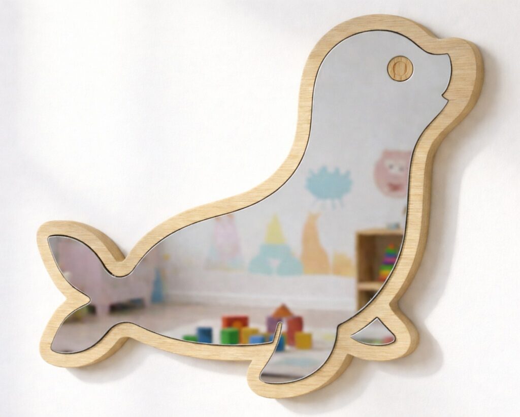 Diseño Encantador: El espejo con forma de foca estilo kawaii/cartoon, perfecto para inspirar juegos y aventuras en el dormitorio infantil o la sala de juegos.