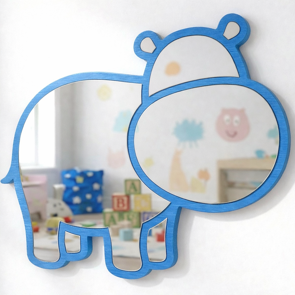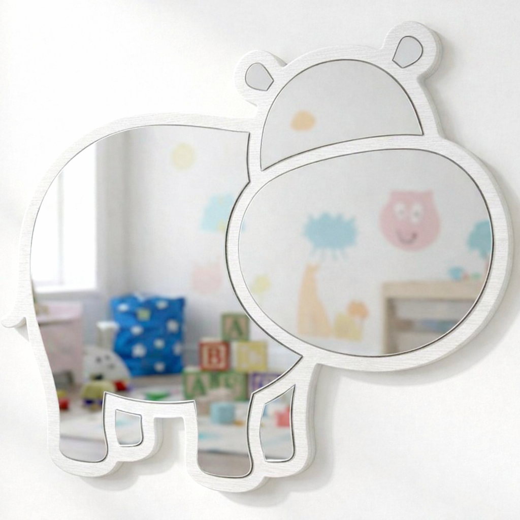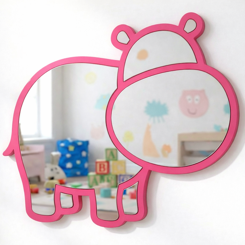 Diseño Encantador: El espejo con forma de hipopótamo estilo kawaii/cartoon, perfecto para inspirar juegos y aventuras en el dormitorio infantil o la sala de juegos.