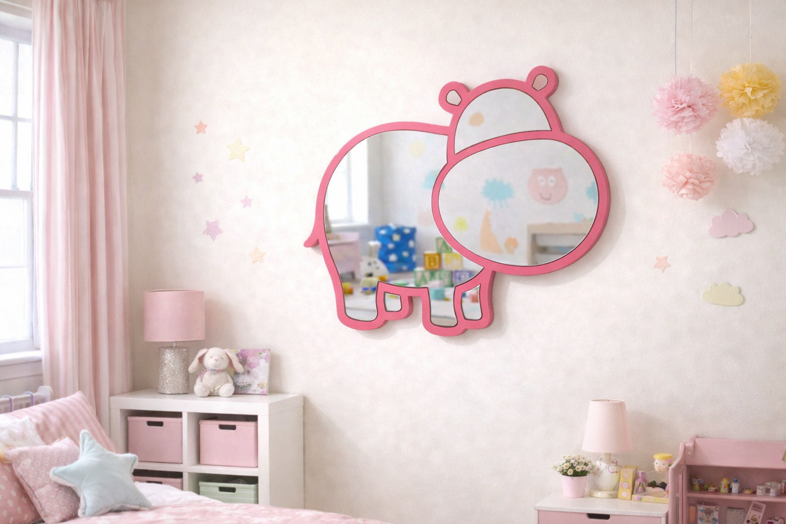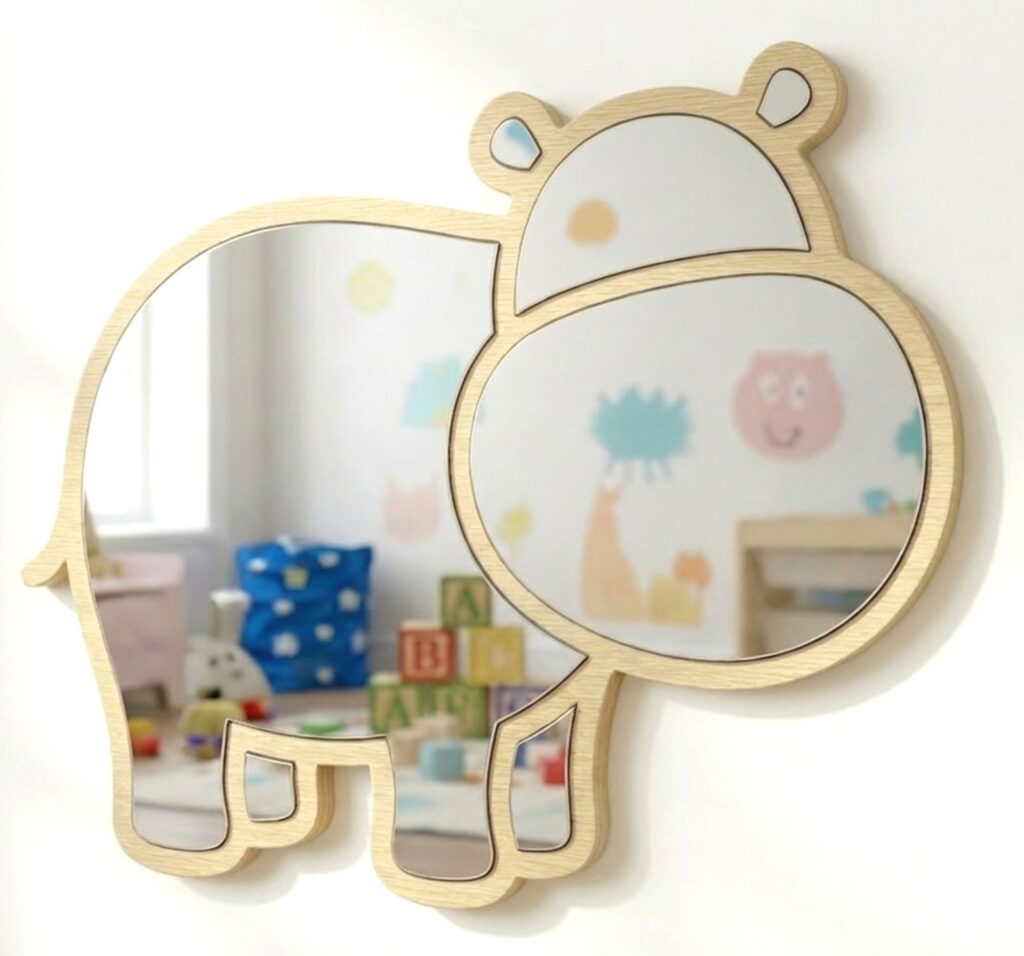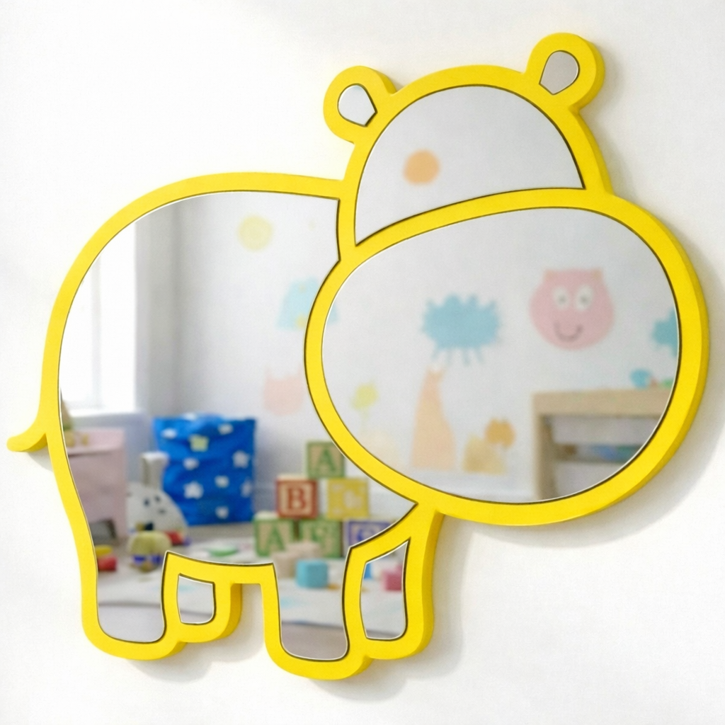 Diseño Encantador: El espejo con forma de hipopótamo estilo kawaii/cartoon, perfecto para inspirar juegos y aventuras en el dormitorio infantil o la sala de juegos.