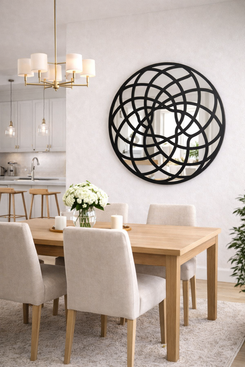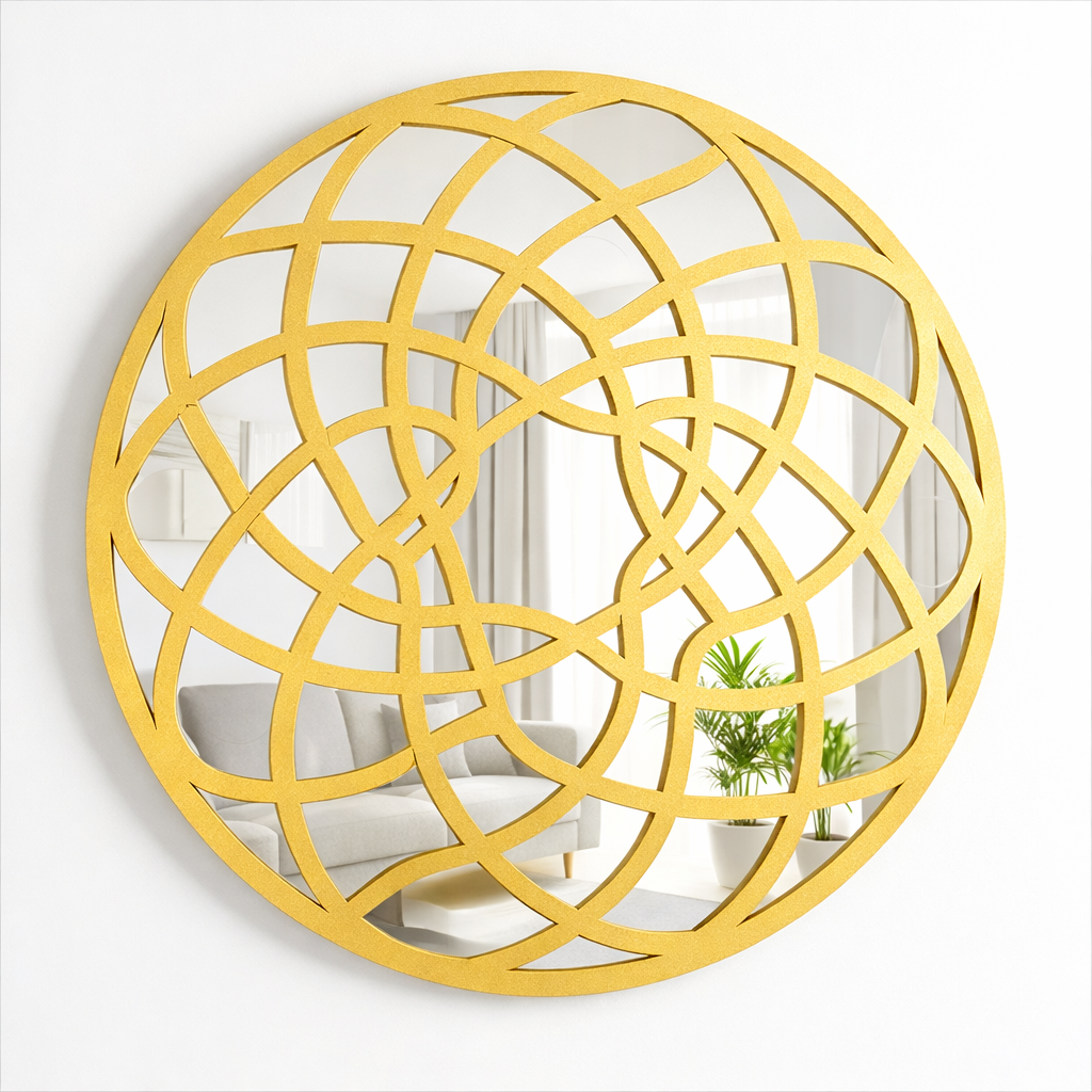 Efecto Multi-Reflejo: La disposición de los diferentes paneles de espejo acrílico no solo es decorativa, sino que también captura y fragmenta la luz y el espacio desde múltiples ángulos, creando una sensación de mayor amplitud y profundidad.